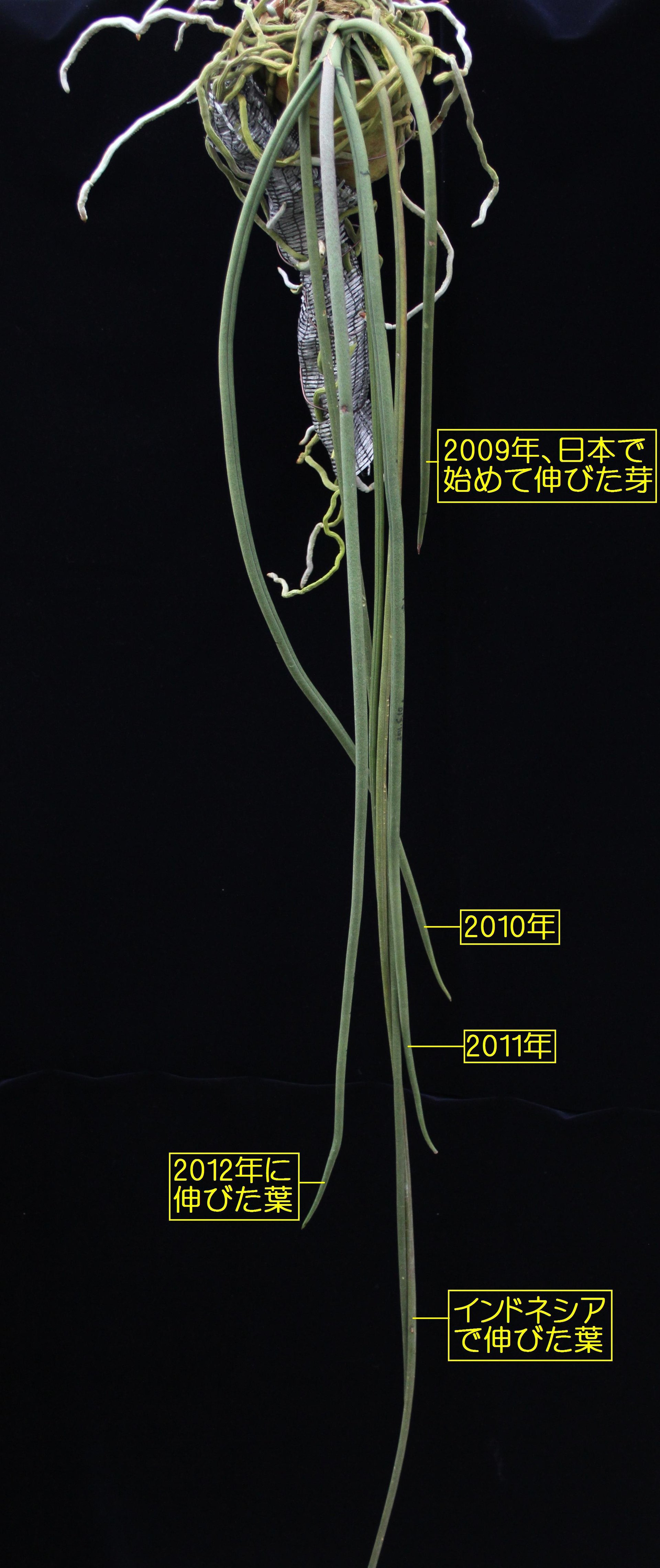 順調に成長しています。 もちろん自生地のインドネシアで育った葉とは比較になりませんが、日本に来た以降の葉は毎年長くなっています。