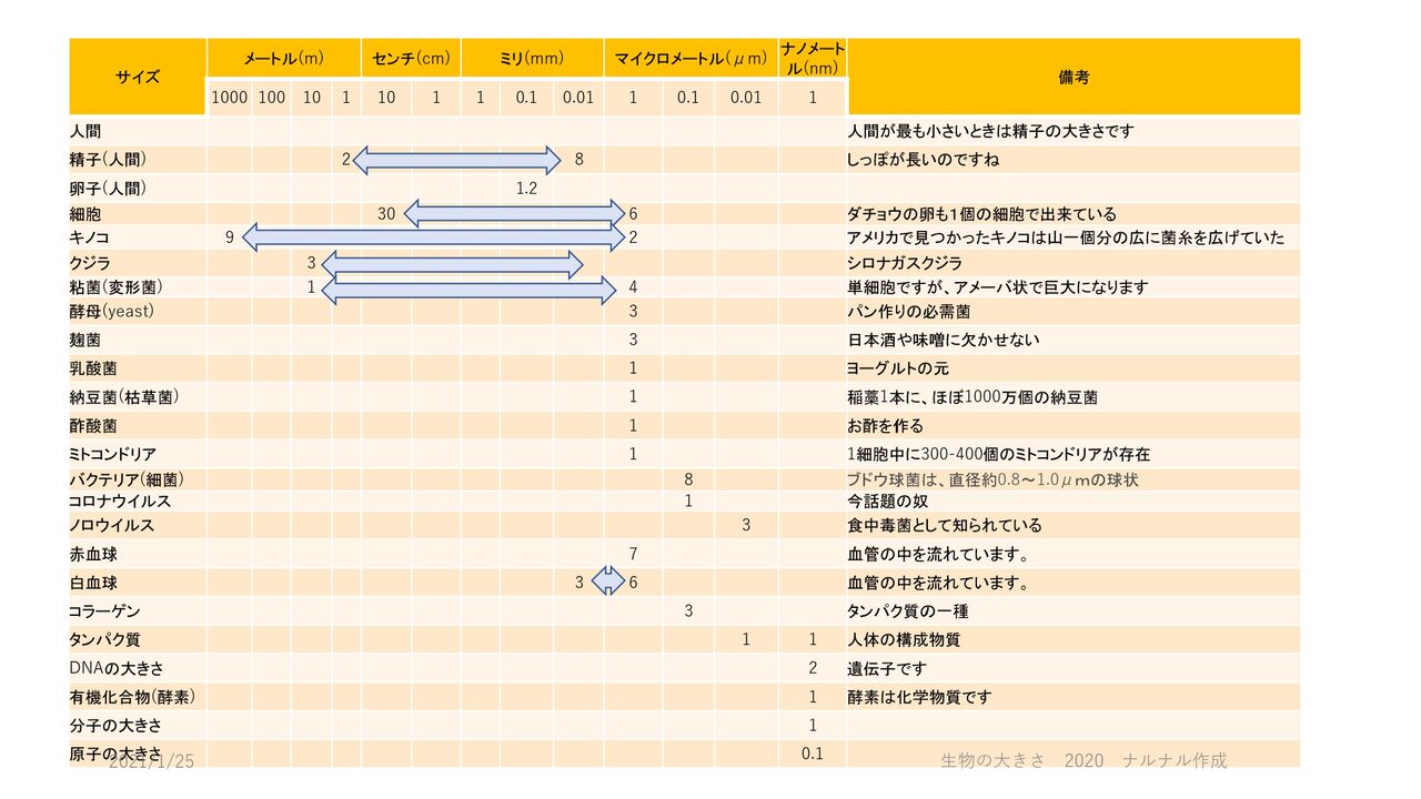 この表で画期的なことは、人間のサイズを精子の状態から見ていることです。