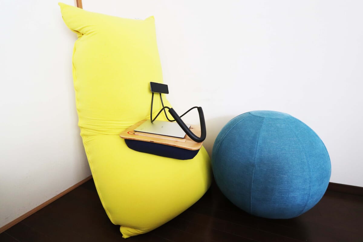 ヨガボーに座りつつ、トレイボー2.0を使って仕事をしていると目線が下になりすぎて、首が少し疲れやすくなります。なので、一番ベストなのはデスクワークでイス代わりに使うことでした。