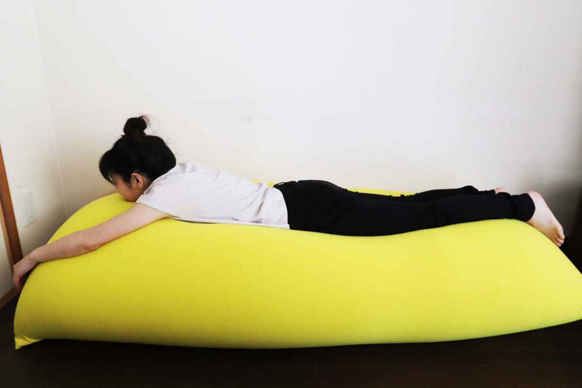 商品が届いて、まずびっくりしたのが大きさ。身長158cmの筆者の頭一つ分大きく、かつなかなかの重さ。CMや雑誌のようにダイブしてみると頭のてっぺんからつま先まですっぽり。ダイブした瞬間、「快適すぎて動けなくなる魔法のソファ」のキャッチコピーに激しく納得。体にピタっとフィットしてしっかりホールドするもんだから動けなくなるんです。
