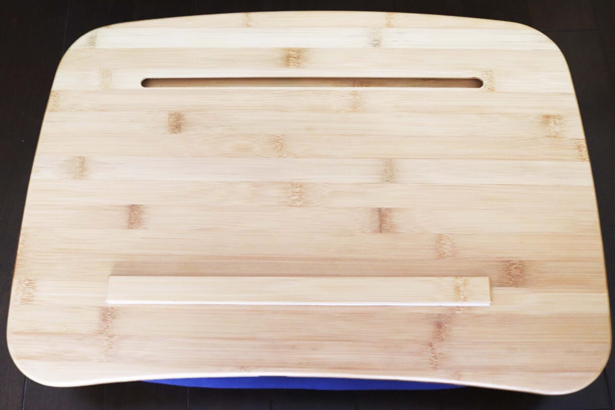 竹素材でできたテーブルは滑らかな触り心地。放熱性に優れているため、8時間以上ノートPCを稼働してもまったく熱くならないのがポイントです。テーブルを支える足の代わりに、ヨギボーマックスにも使われているビーズクッションがトレイ裏に付いています。