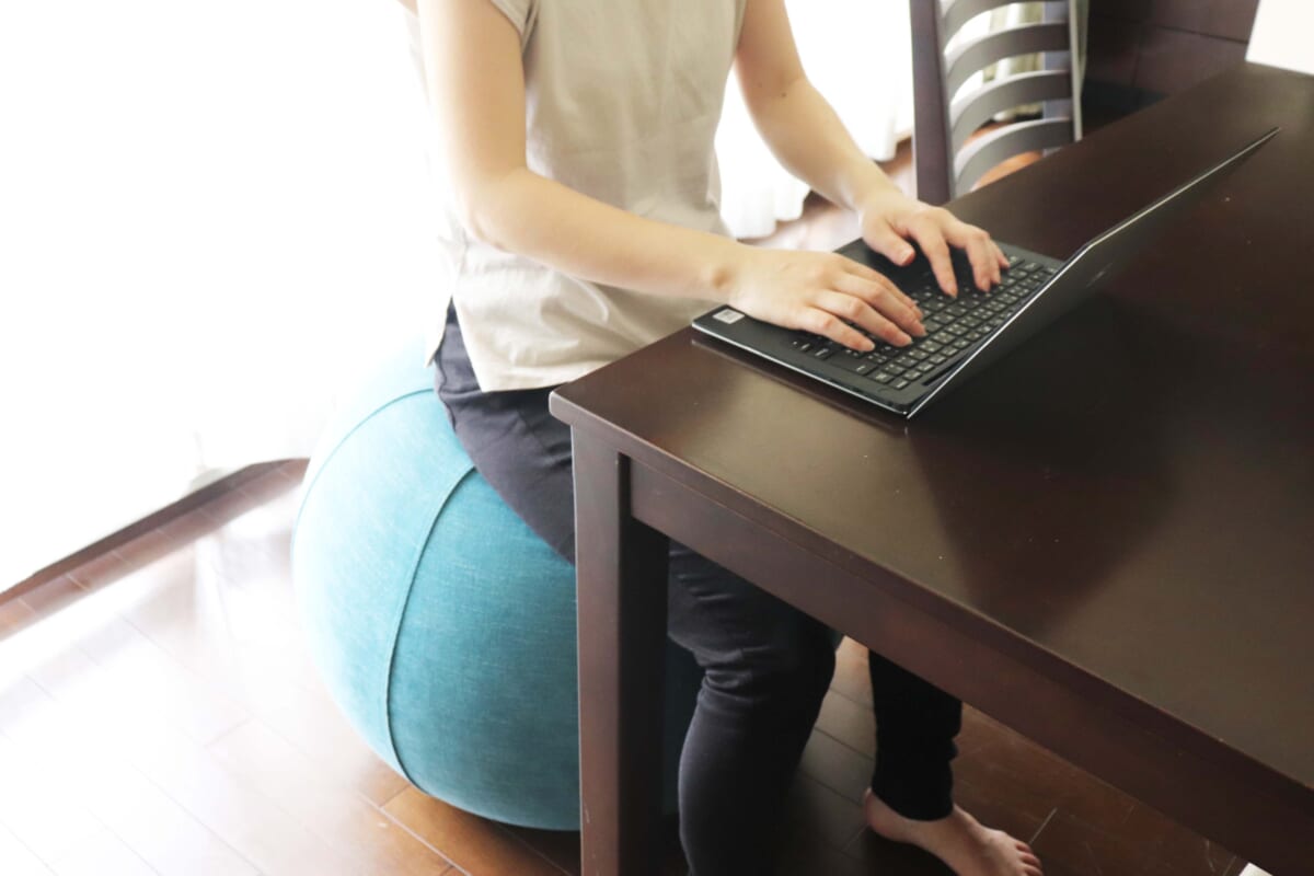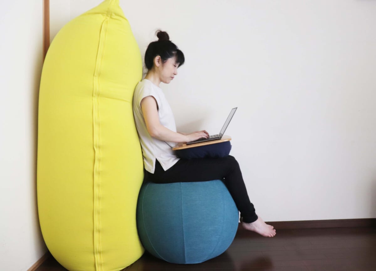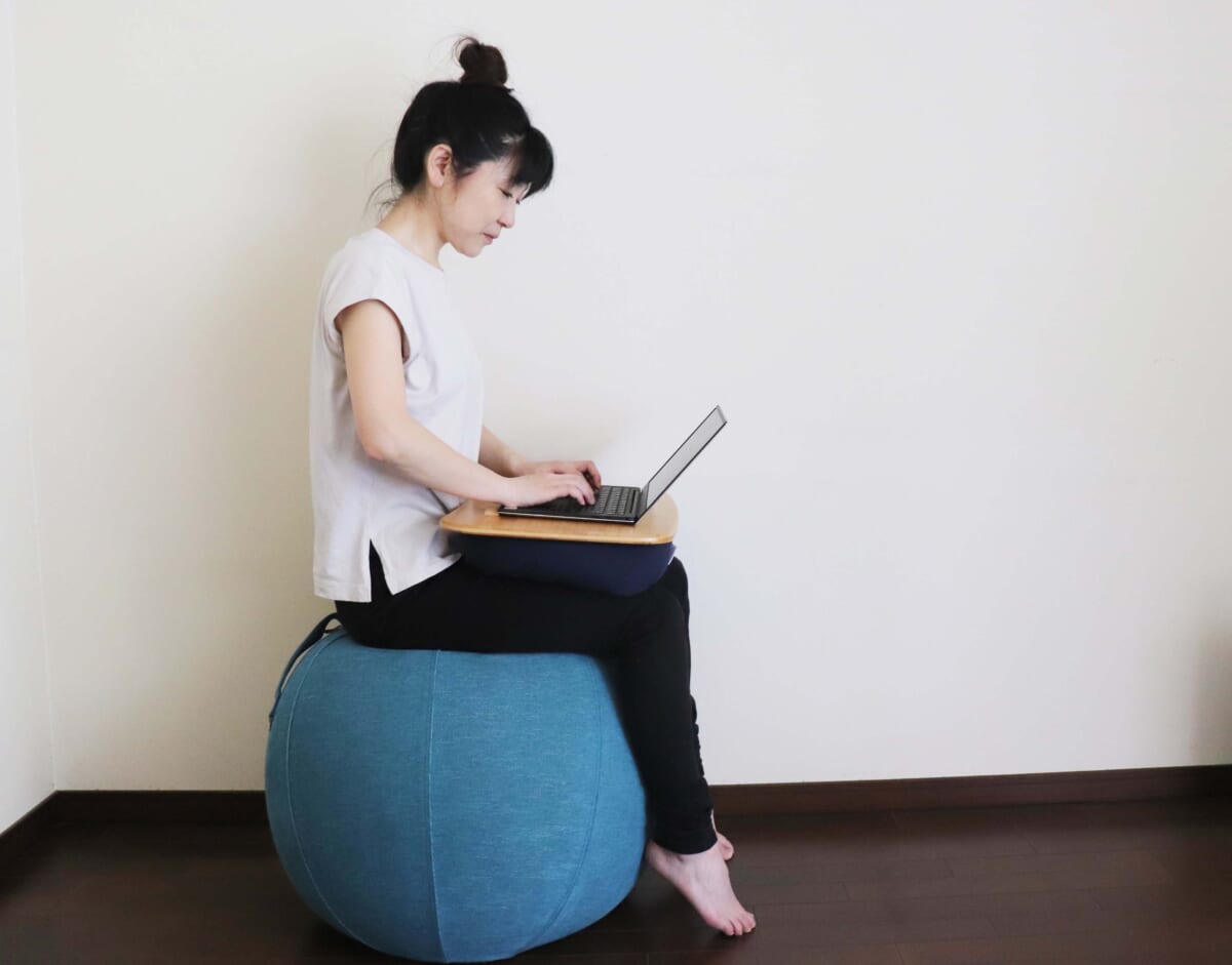 早速、ストッパー付きのヨガボーでリモートワークしてみました。ヨガボーに座り、トレイボー2.0を膝にのせ業務開始。背筋をピンと伸ばして座ればまったくゆらゆらしません。というより、ただ座るだけで力を入れることなく、背筋が自然と伸びちゃうんです。