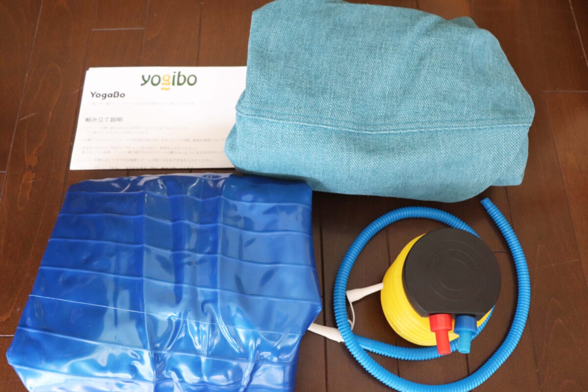 まずはセッティングから。ヨガボーは自力で空気を入れて膨らませます。布カバーの中にインナーボールをセットしたら空気入れ開始。「楽勝~! 楽勝~!」と、適当に手でポンプを押していたのですが、これがなかなかボールが膨らまない。必死に押し続けると、キュインキュインと小動物が鳴いているような音を出しながら約10分でパンパンに膨らみ、完成しました。
