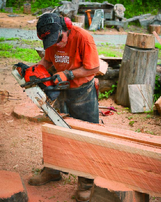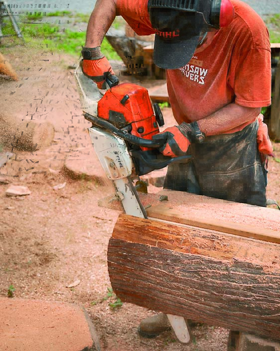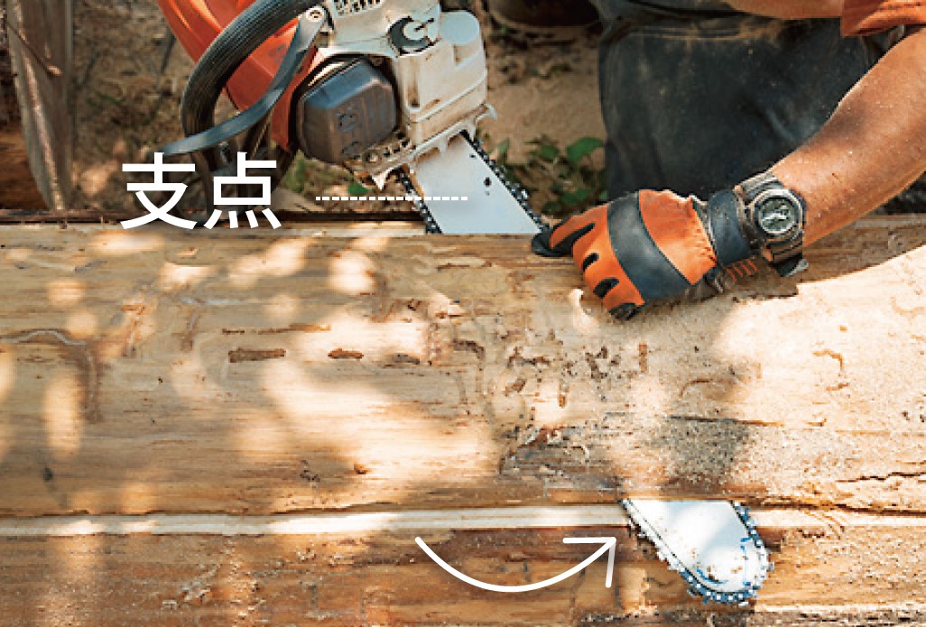 バンパースパイク(ガイドバーの根元付近にあるギザギザ)を支点にして切り込み、technique1と同様にガイドバーを斜めにしてカットしていく(*作業現場はオガクズを敷き詰めてあるので材を地面に置いたまま最後までカットできる。そうでない場合は材を安定した台に載せて作業するといい)