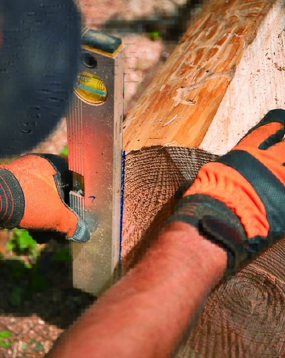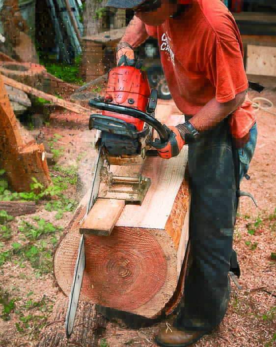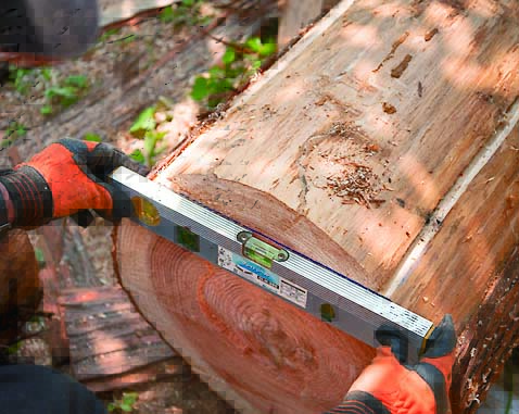 ランバーメーカーのガイドレールを丸太の曲面に設置する場合は、水平にすること。そうすればガイドバーが垂直になり、垂直な面を切り出せる。