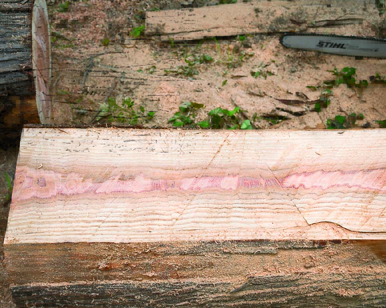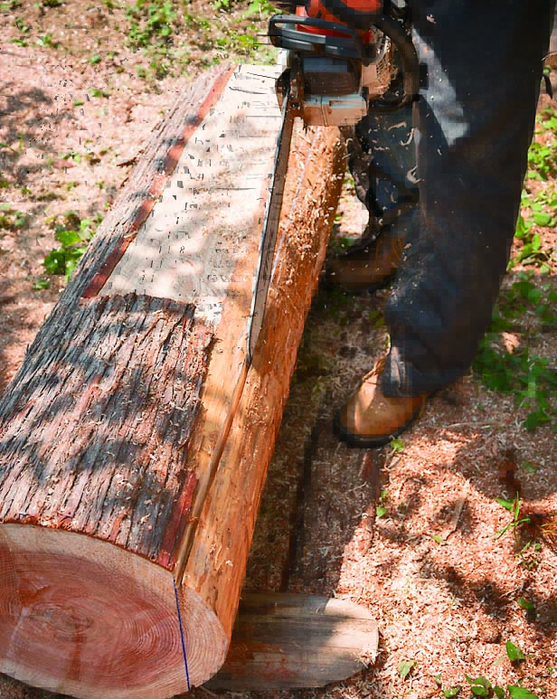 曲面を切り落とすように丸太を割いて、平面を作る。それを4回繰り返せば、断面が四角の板や角材になる。まずは補助道具を使わずにチェンソーだけで割く方法を紹介。