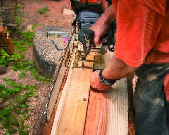 市販の補助道具を使えば、チェンソーで、より精密な製材が可能になる。製材用の補助道具は一般的に「ソーミル」や「ランバーメーカー」と呼ばれ、ガイドバーを水平にセットして切るタイプと、縦向きにセットして切るタイプがある。ここではインストラクターの栗田さんが所有する、縦向きタイプを使った作業例を紹介する。