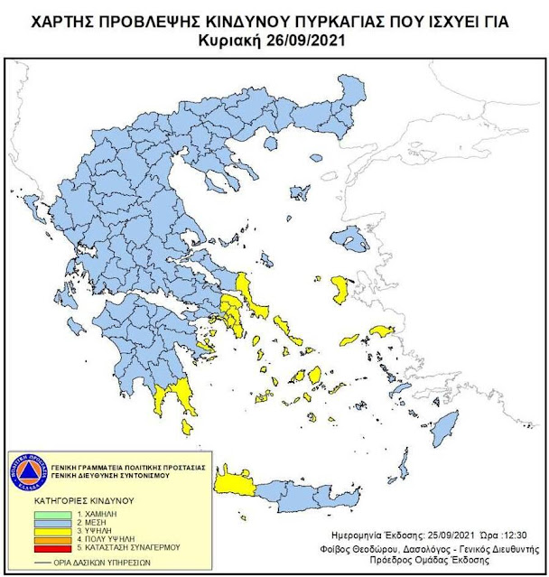 Σύμφωνα με το Χάρτη Πρόβλεψης Κινδύνου Πυρκαγιάς που εκδίδει η Γενική Γραμματεία Πολιτικής Προστασίας του Υπουργείου Εσωτερικών και Διοικητικής Ανασυγκρότησης, για σήμερα Κυριακή 26 Σεπτεμβρίου, προβλέπεται υψηλός κίνδυνος πυρκαγιάς (κατηγορία κινδύνου 3), σε Αττική, Κύθηρα, Κυκλάδες, Σάμο, Ικαρία, Χίο, Ψαρά, Χανιά και σε περιοχές Ευβοίας και Λακωνίας