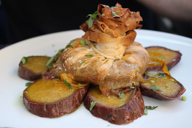 Duck within a crispy filo pastry on a bed of steamed sweet potatoes.