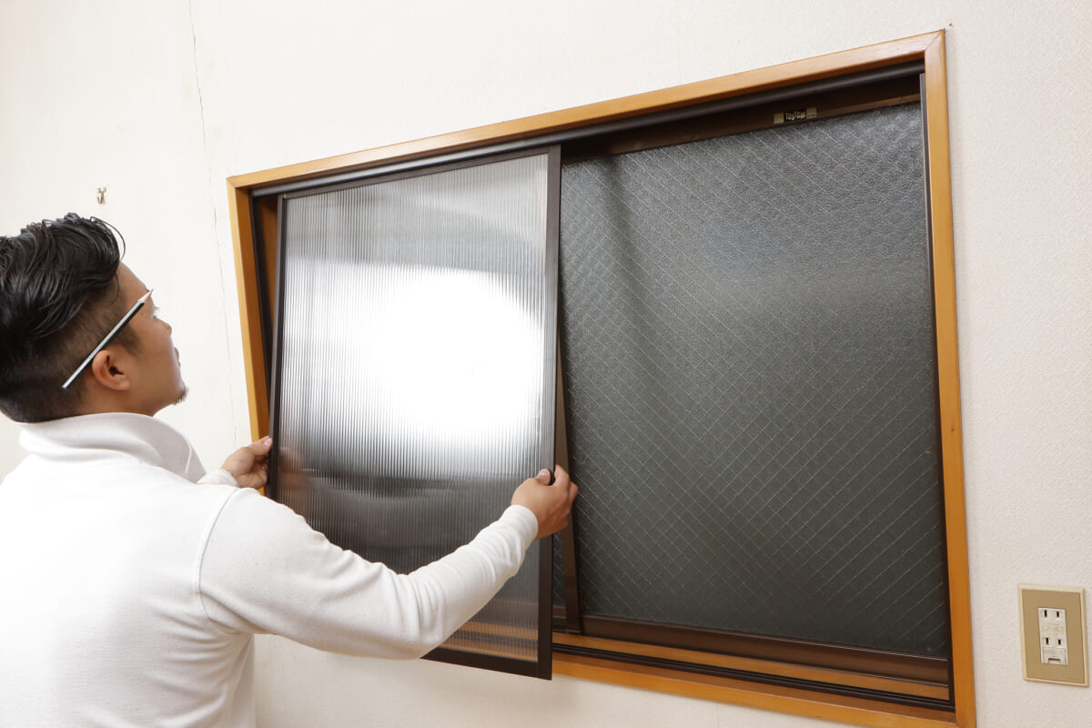 「エコな簡易内窓キット」(アクリサンデー)という製品で既存の窓の内側に、二重窓を作る。樹脂製のフレームに中空ポリカをはめ込んだ簡単な作りではあるが、断熱性アップの効果は高い。資材のカットは大型刃タイプのカッターが1本あればOK。3時間程度で作業を終えられるので、この冬の断熱対策としてチャレンジするにはぴったりだ。