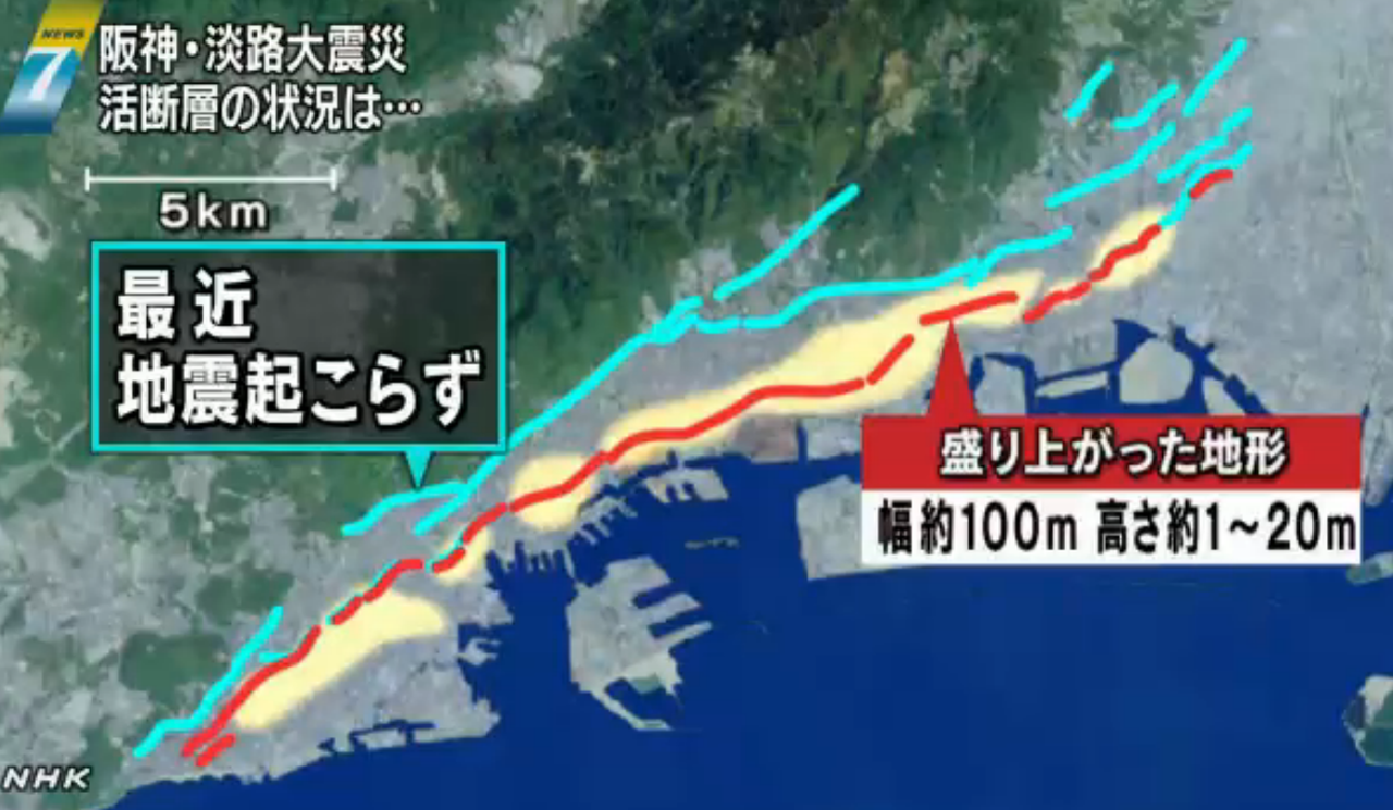 最新の地形図で、阪神淡路大震災の神戸の「震災の帯」の直下に、活断層らしき隆起した部分があることが新たにわかったとのこと。