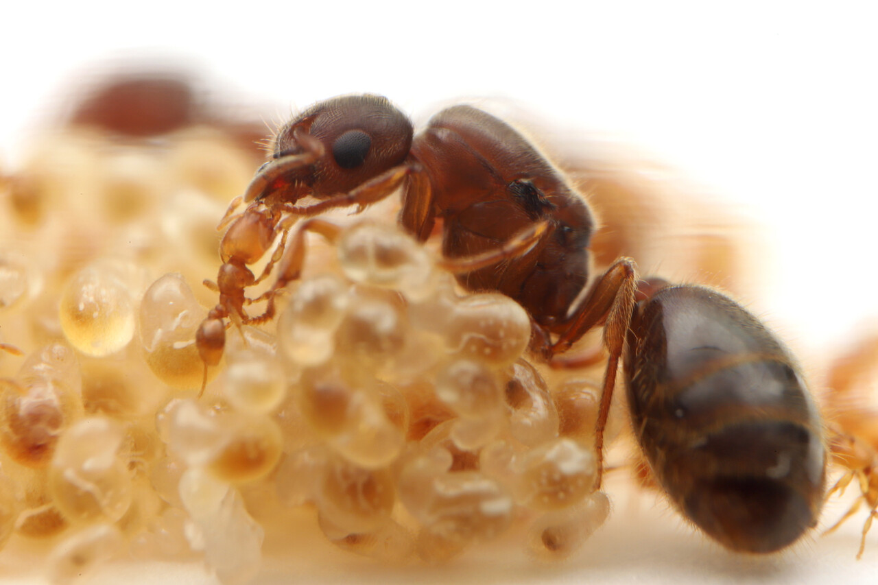働きアリの大きさは、どちらも1mmほどとほとんど同じなのですが、オニコツノアリの方が歩くのが早くて、遠出をして食料を探します。