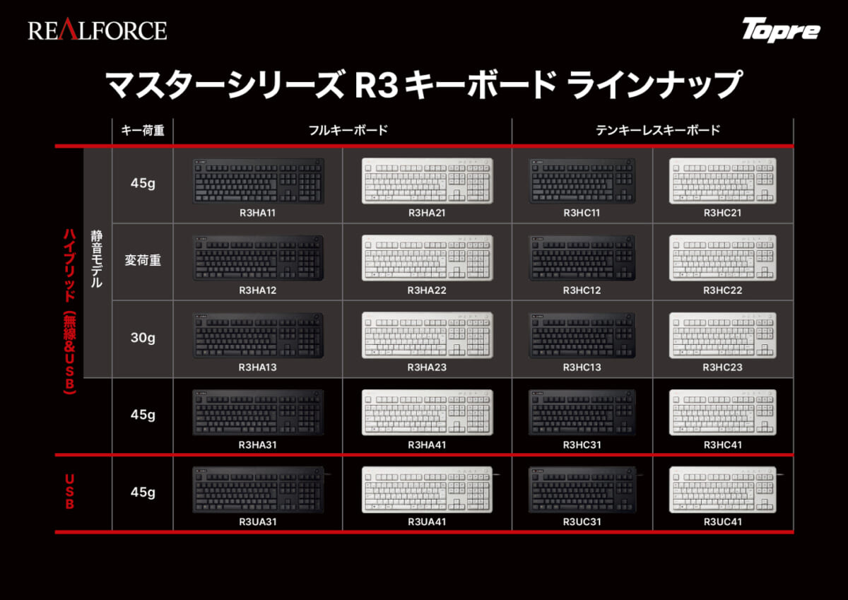 東プレは、静電無接点容量方式スイッチを採用したPC用キーボード「REALFORCE(リアルフォース)」の新製品「R3キーボード」20種類を11月1日に発売します。また、既存の「R2」シリーズ日本語配列モデルを10月29日で生産終了することを発表しました。