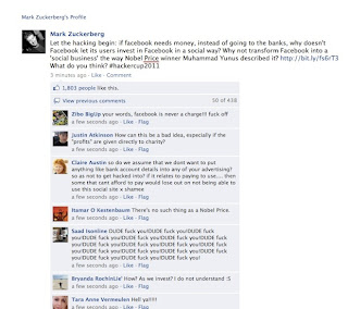 “Biarkan hacking ini dimulai: bila Facebook butuh uang dan tak pergi ke bank, kenapa Facebook tak membiarkan penggunanya berinvestasi di Facebook secara sosial? Kenapa tidak mengubah Facebook menjadi sebuah ‘bisnis sosial’ seperti yang dilakukan oleh pemenang Nobel Muhammad Yunus? http://bit.ly/fs6rT3 Bagaimana pendapatmu? #hackercup2011″