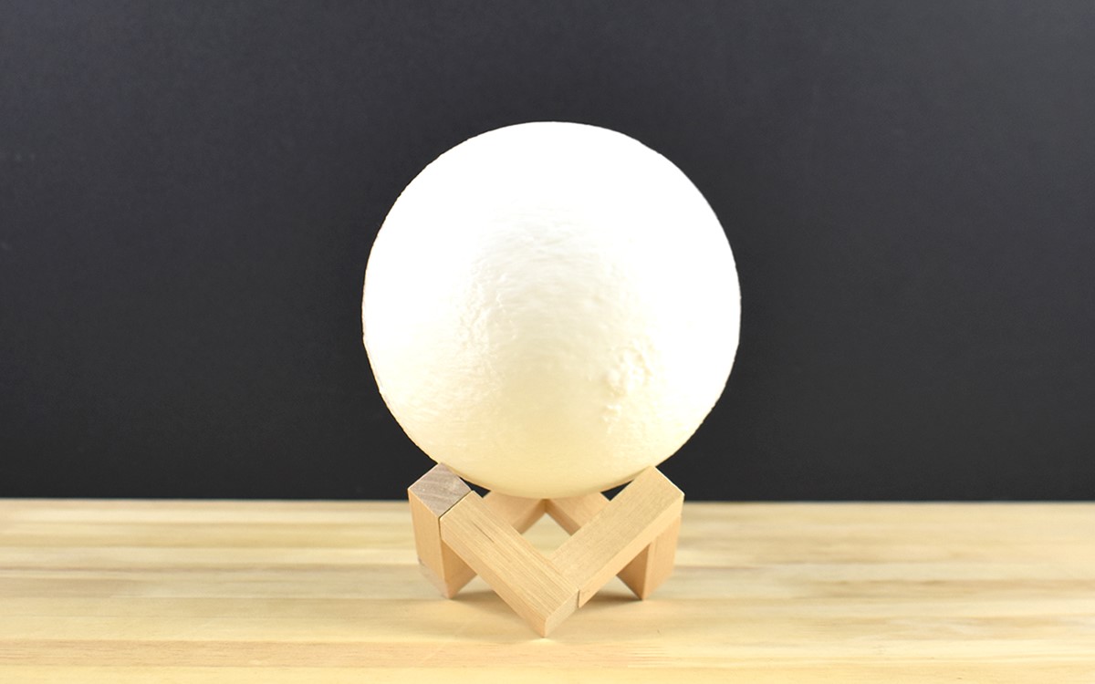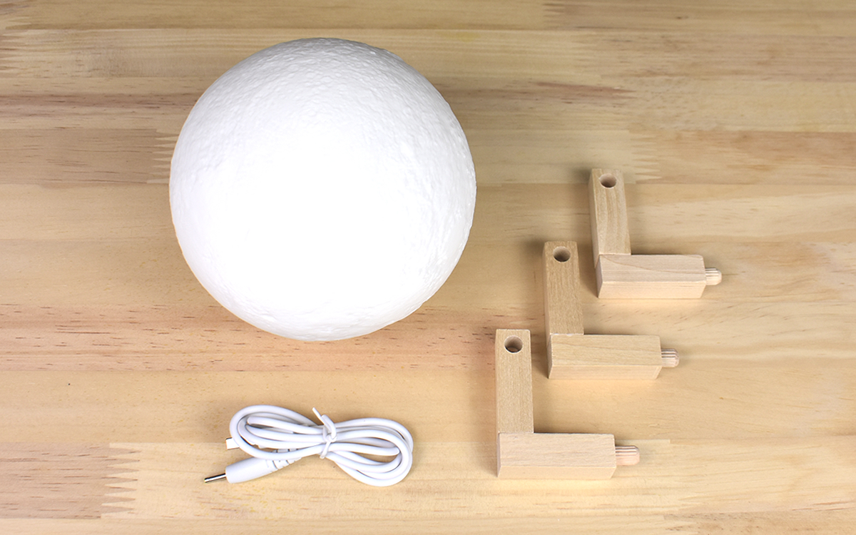 3Dプリント月球ランプ本体・充電用USBケーブル・組み立て式の月球ランプベースがセットになった同商品。ランプの直径は12cmあり、3Dプリントによって月の模様がしっかり再現されているのが特徴です。