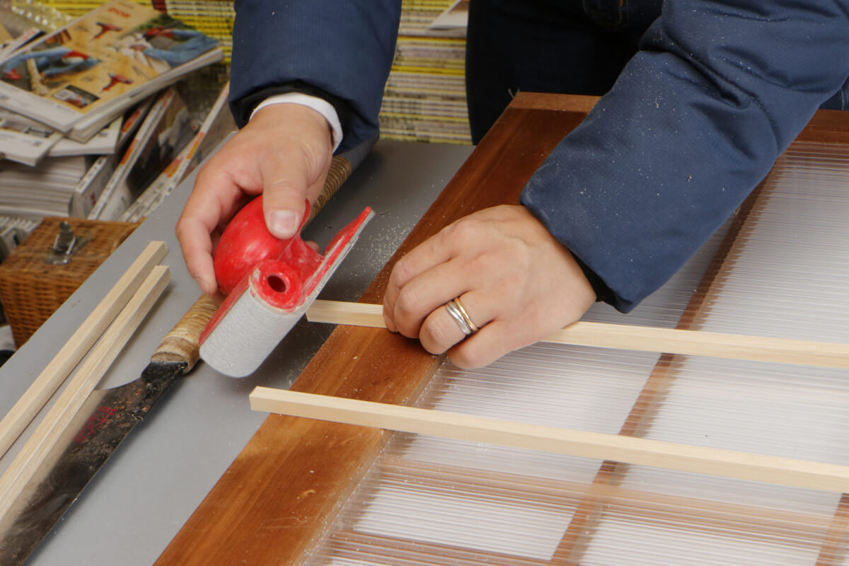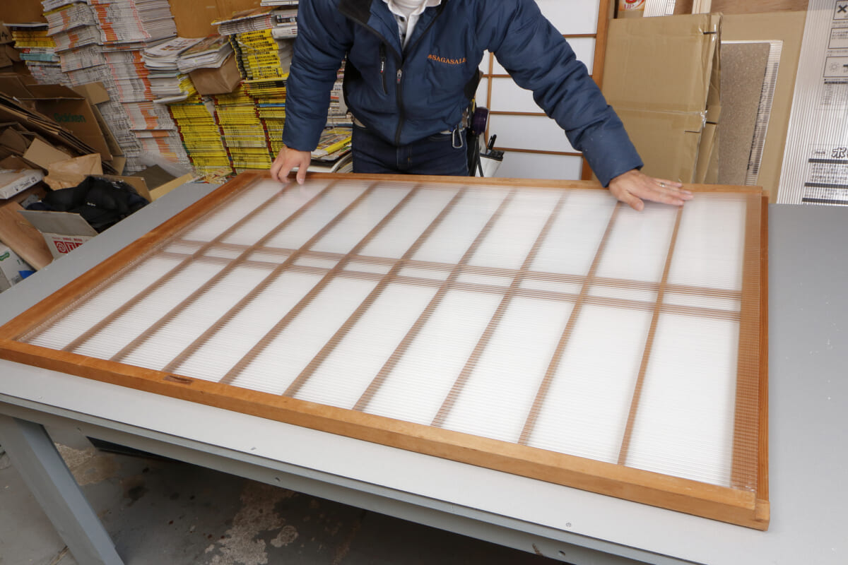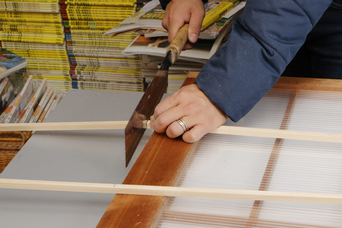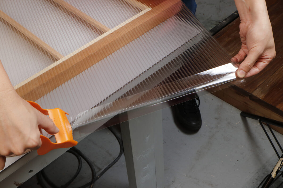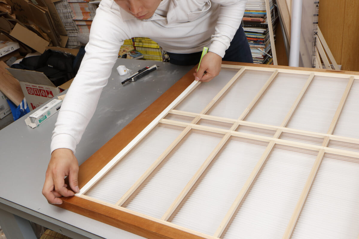 ポイントは障子の桟・框(以下、枠)内に、収まるように資材を用意すること。組子から枠の奥行を測り、はめ込む中空ポリカと角材の厚みを決めよう。今回施工した障子は、13mmの余裕があったので、4mm厚の中空ポリカ+9mm角材を使った。また、最後に張る障子紙は、丈夫で両面テープで張れる、通気性がないため断熱性能が高い、プラスチック系のものを使うのがおすすめだ。