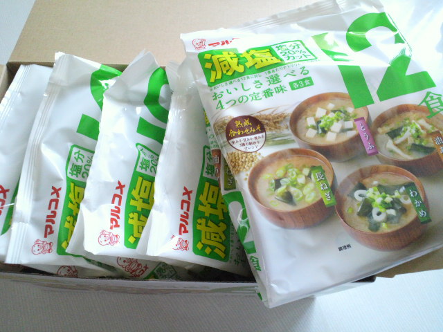 会社のお昼ご飯は いつも給食弁当を食べてます でもあんまり美味しくないんで ふりかけや佃煮やみそ汁は欠かせません(^^;) なので会社のお昼用に買いました マルコメ 減塩みそ汁 12食 箱の中身は 12食入りが5袋入って60食分です(^^ゞ 具は とうふ・油あげ・長ネギ・わかめの4種類 この時は988円でした なので1食 16.47円! やっぱり安い~ もう半分は食べたけど まだまだ楽しめますo(^-^)o ご馳走さまです(*^^*)