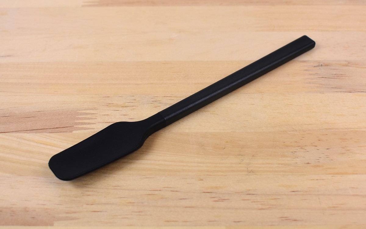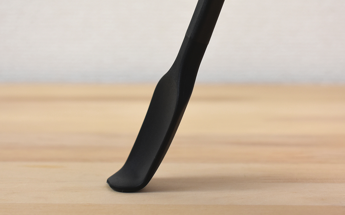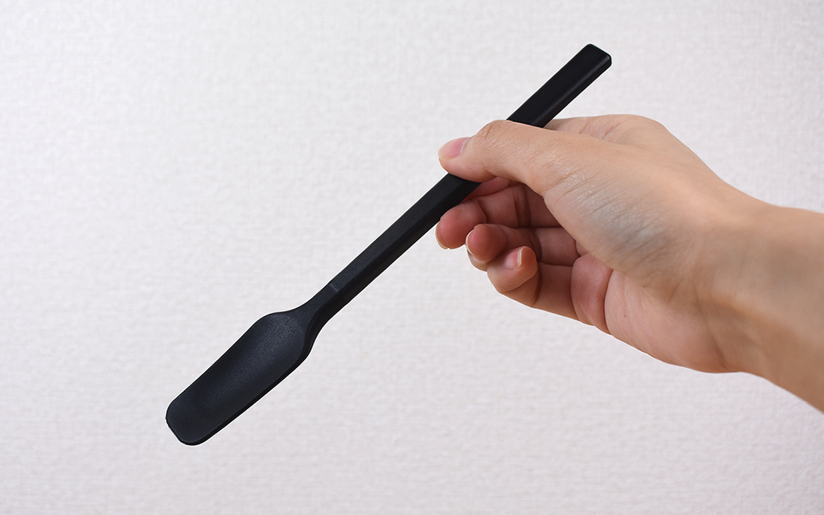 同商品の全長は約19cm。ご覧のとおり持ち手の部分だけでなく、スプーン本体もヘラのように細長い形状をしているのが特徴です。ちなみに持ち手はナイロン製で、スプーン部分がシリコーンゴム。スプーンにしては珍しく黒1色のシックなカラーリングが目を引きますが、食材による着色が目立たないという利点もありますよ。