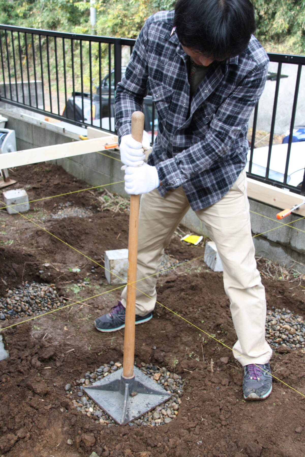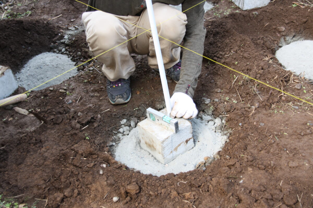 基礎が置かれる地面をある程度平らにならし、各基礎石(束石)の設置場所を決めてから、一度基礎石をはずし、基礎石よりひと回り広く50mm以上掘り込む。穴の底をよく突き固めたら砕石を充填し、砕石が動かないように突き固めて、コンクリートを打ち、その上に基礎石を配置する。並べた基礎石が互いに水平になっているか確認し、最後に土で埋め戻せば作業完了だ。