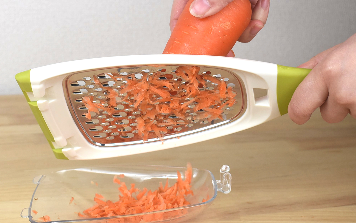 実際にアイテムを使用してみて、「これは便利だな」と感じたポイントの1つがおろし器の“ストッパーヘッド”。おろし器の先端を支点に力をかけても滑らず、ご覧のとおり均一の大きさで素早く野菜をおろすことができました。