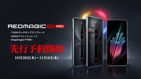 ZTE傘下のNubia Technology(以下、Nubia)は26日、最新ゲーミングスマートフォン(スマホ)「REDMAGIC 6S PRO」おを日本向けに発売すると発表しています。発売日は2021年11月5日(金)を予定し、発売に先立って11月28日(木)より先行予約受付を実施するとのこと。
