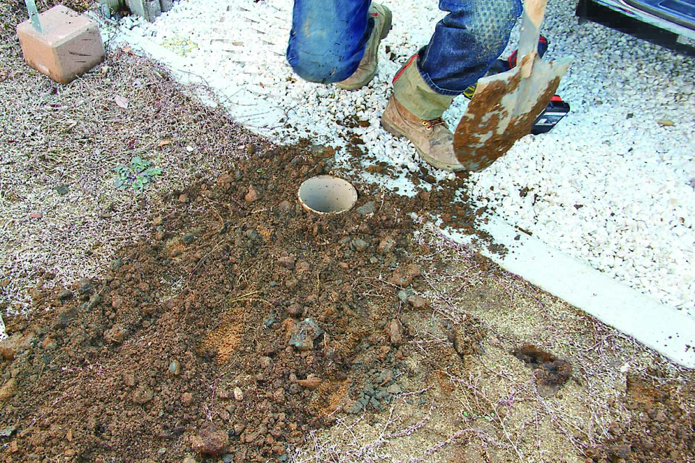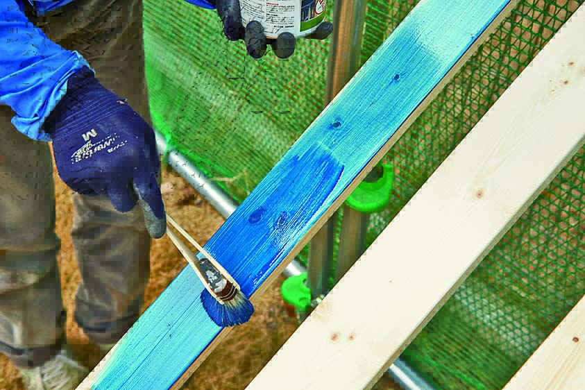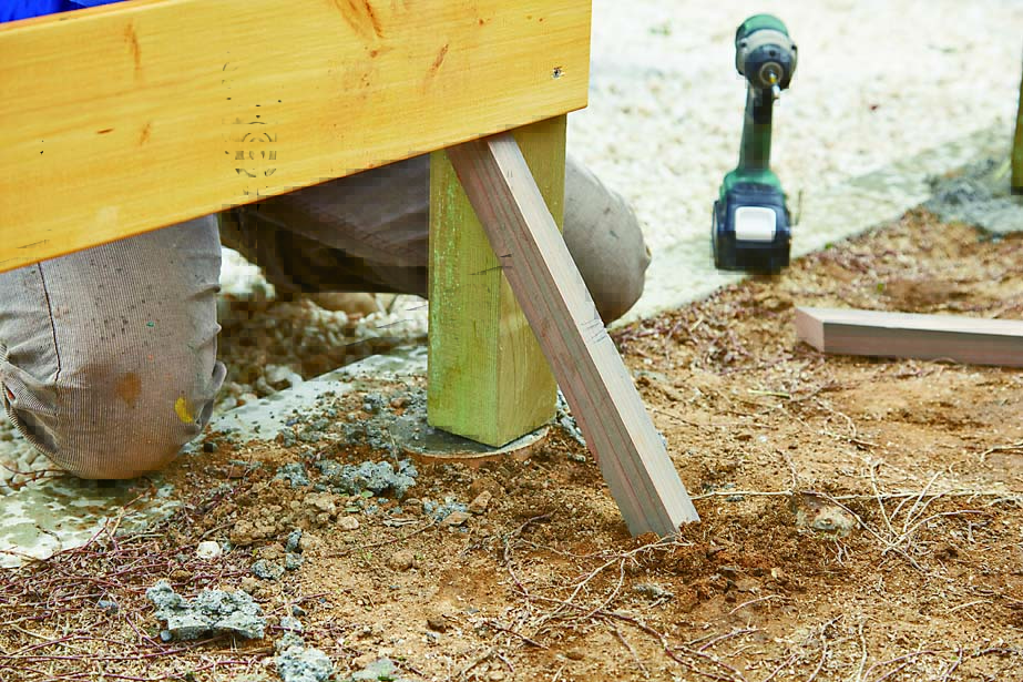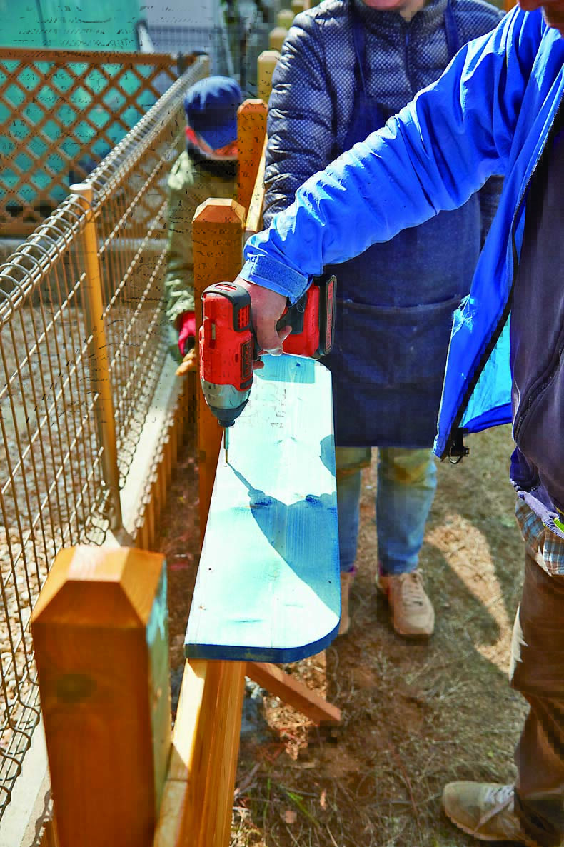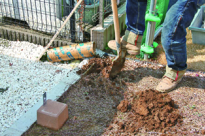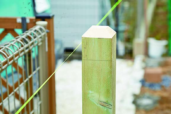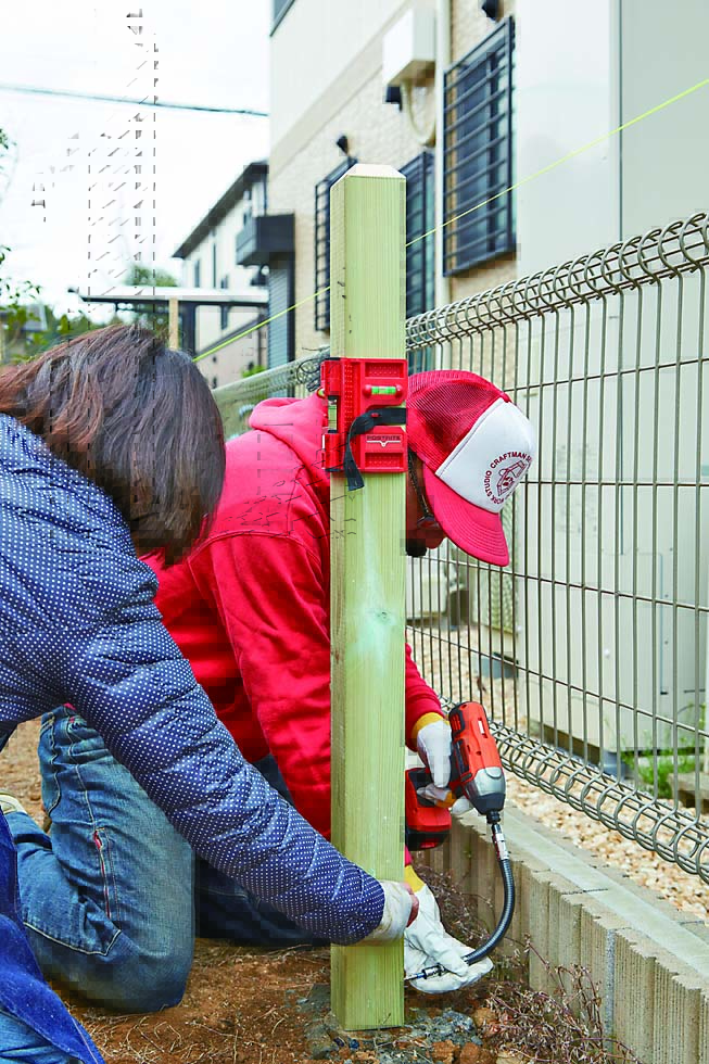 製作のポイントは、基礎を設置する位置をそろえることと柱を水平&垂直に取りつけること。基礎を正確に設置するには水糸が必要。水糸をピンと張って、すべての基礎の位置がそろっているかを確認したい。柱を取りつけるときは水平器で垂直を、水糸で水平をしっかり確認しながら取りつけていく。また、フェンスの板を2段目まで取り付けても柱がグラグラするときは地面に杭を打って柱に固定するといい。