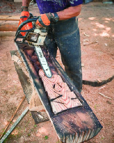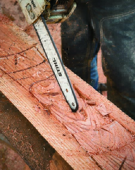 最後に好みに応じて装飾を施せば完成。ここではチェンソー木工らしいワイルドさを強調する仕上げに。