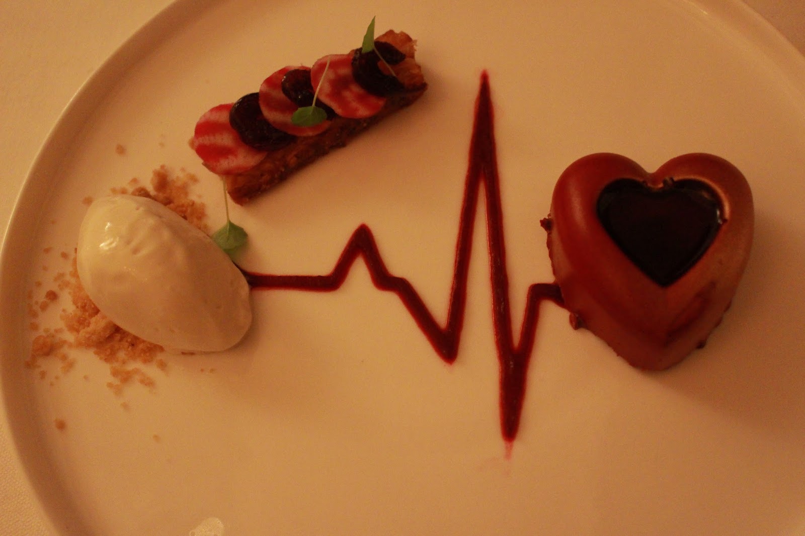 Course 7: The finale of a chocolate mousse heart with an almond tartlet, tonka bean ice cream and beetroot syrup.