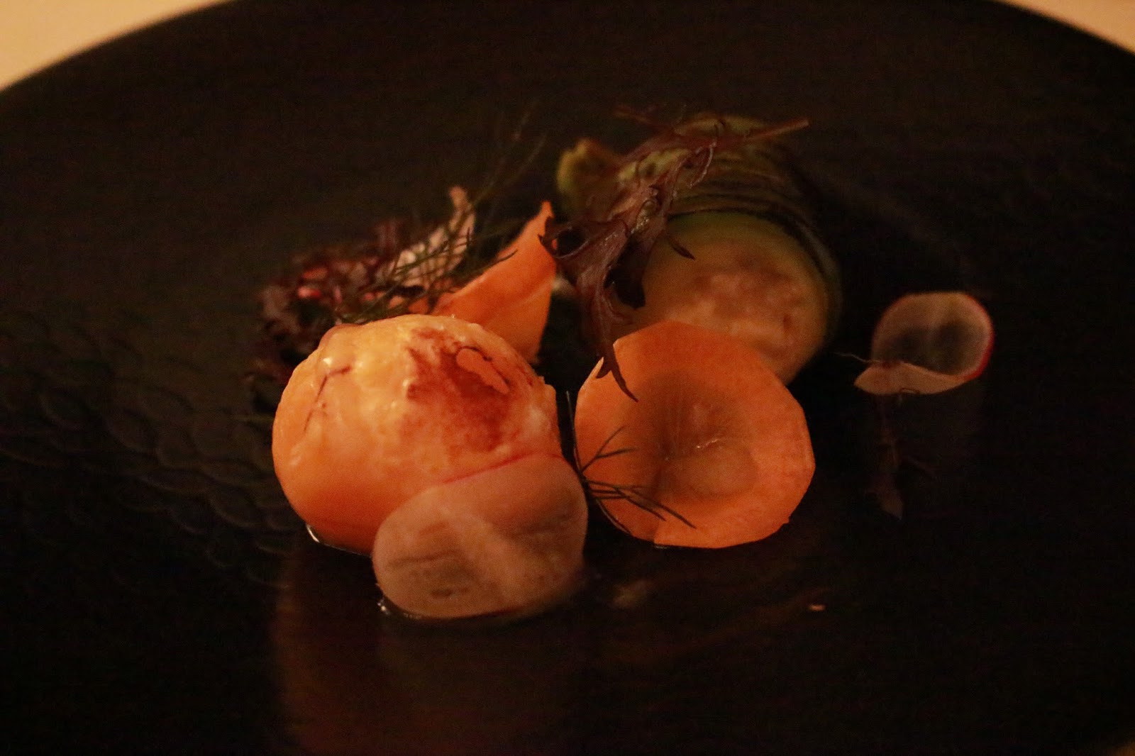 Course 2a: avocado wrap with an egg yolk and thin slices of radish and carrot.
