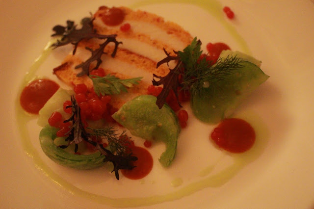 The first course also came with a neat little side salad of tiger tomato, quinoa-cucumber package and a vinaigrette of lovage.