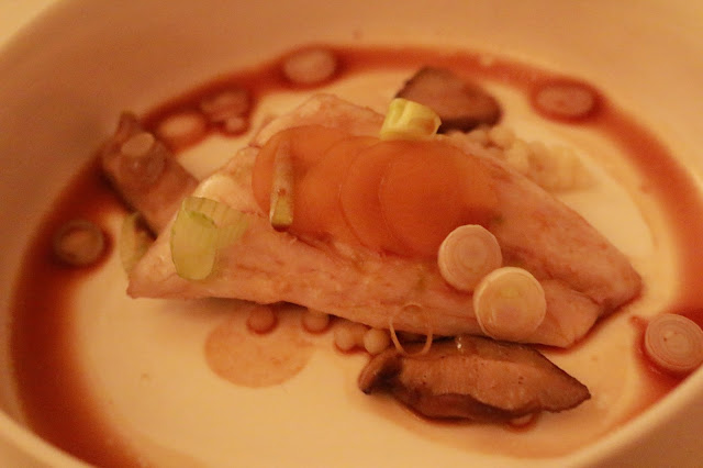 Course 2b: filet of seabass, poached with bay leaves served with spring onion, mushrooms in a 10-year-old soy sauce.