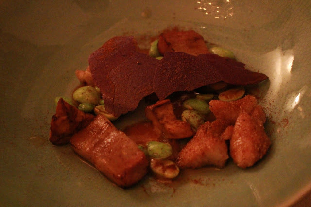 Course 4: Slowly braised pork belly, served with sweetbread of veal and an ice wine vinaigrette