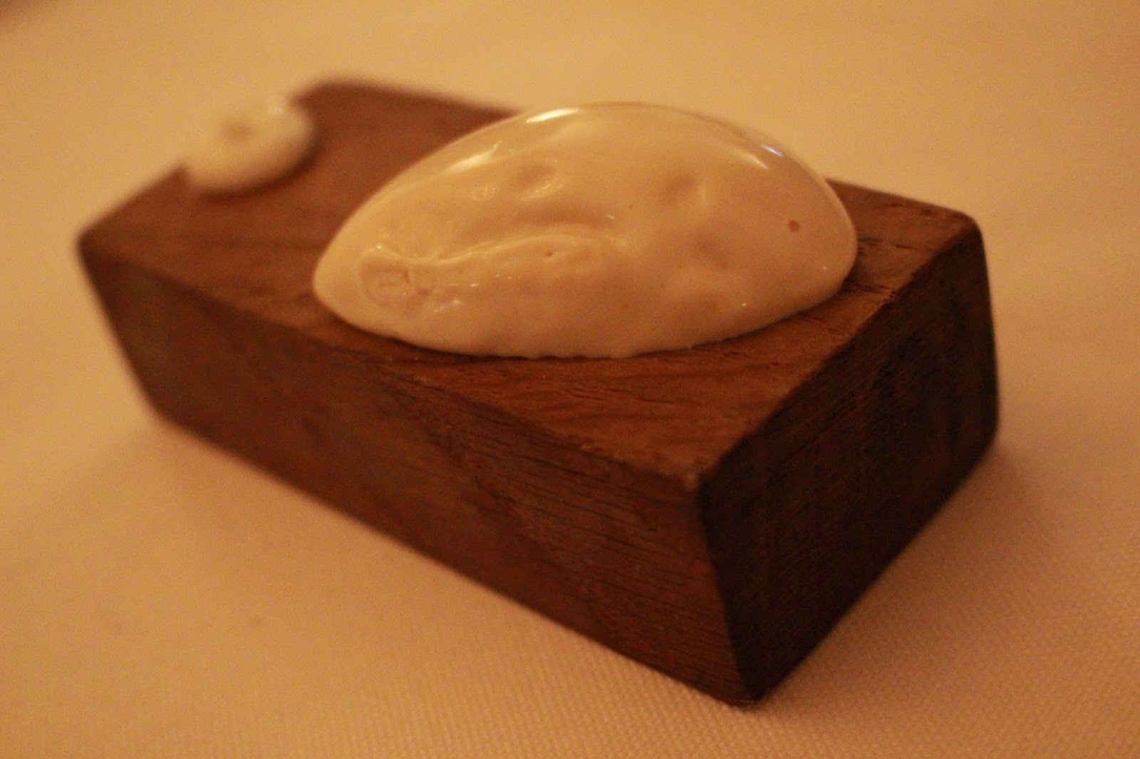 Pre-dessert: Tonka bean ice cream served on a cold wooden block with a dab of goat’s cheese