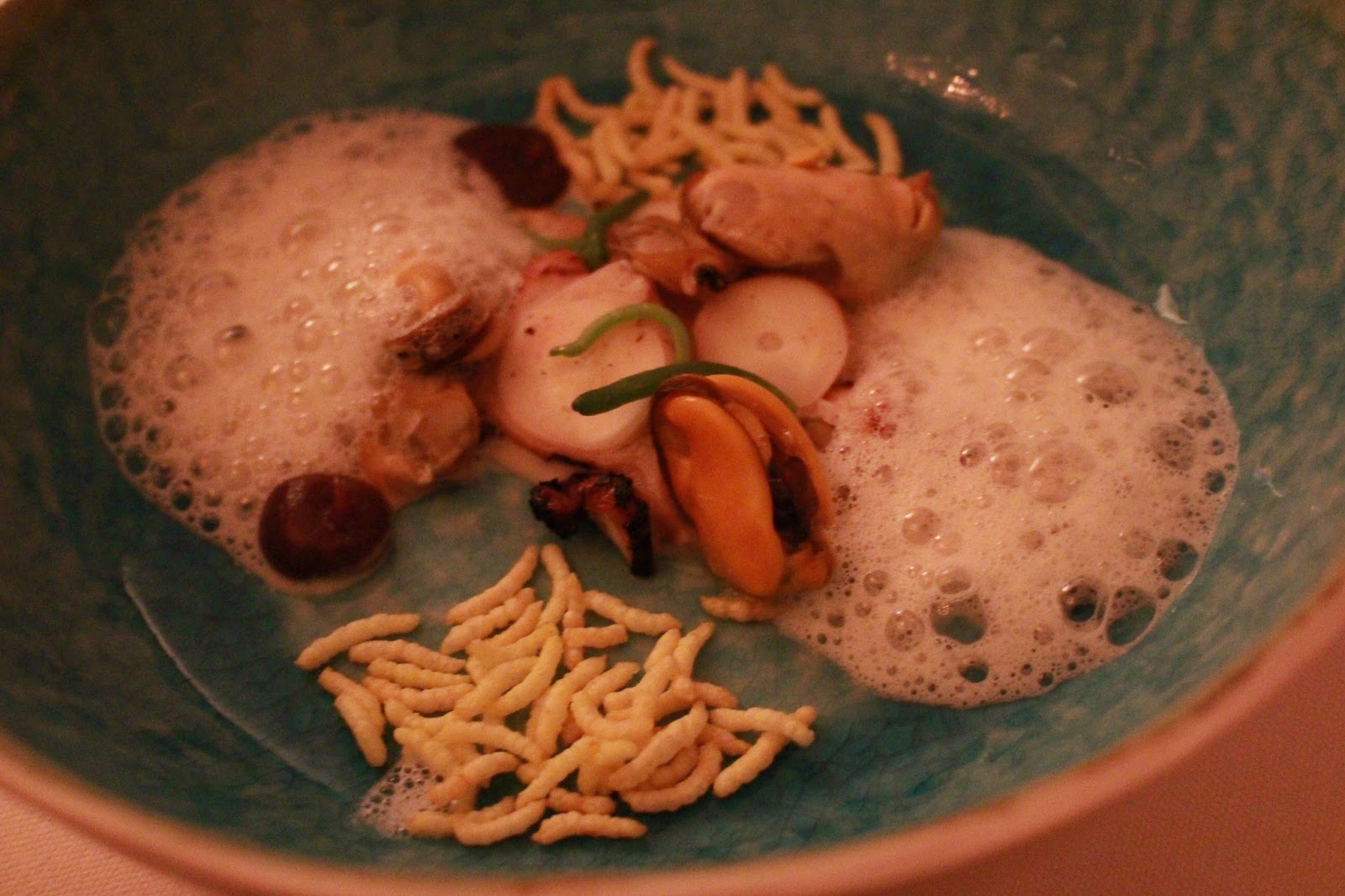 Course 3: Barbecued octopus, mussels and clams, a white bean froth, with coconut and crispy saffron rice