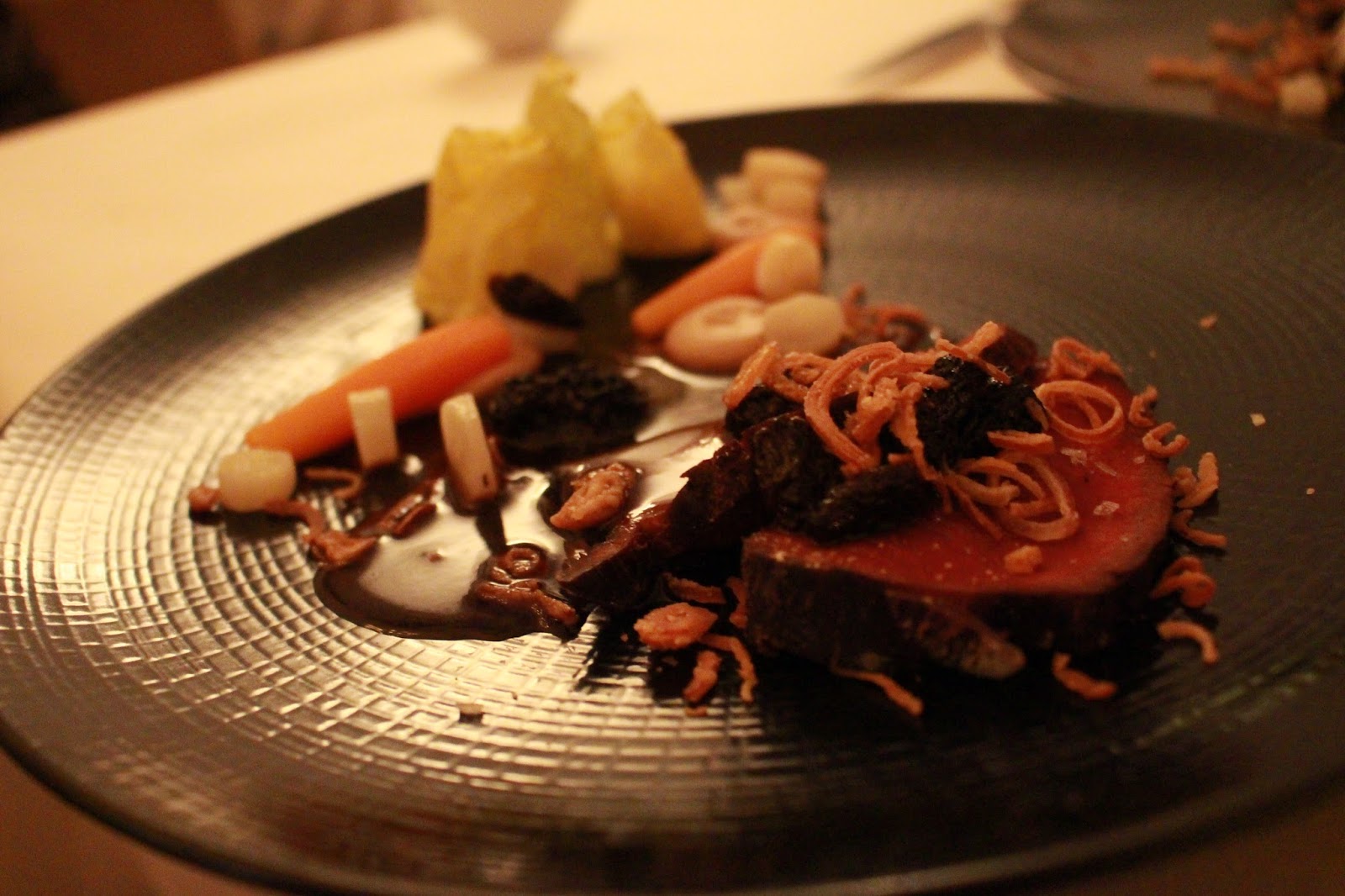 Course 6: Wild deer slowly braised with spices, orange sauce, chestnut cream and ginger.