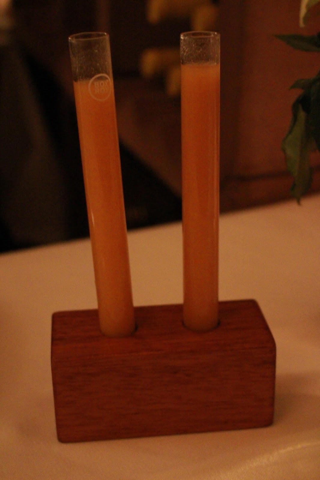 Course 1: pre-course lentil soup which came presented in test tubes.