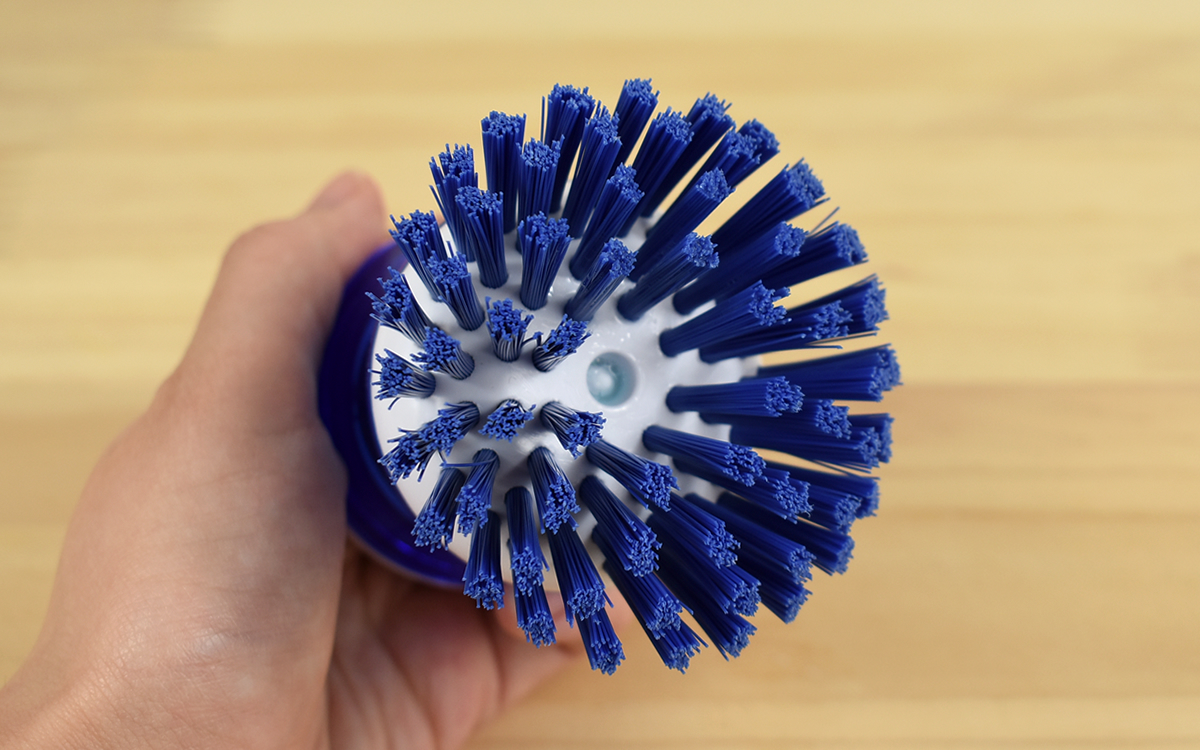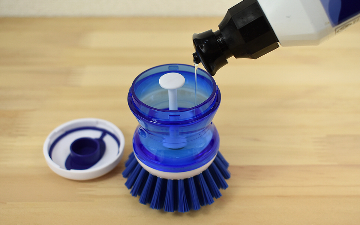洗剤を入れた後は、ブラシを使う際にキャップについているプッシュボタンを押すだけ。ブラシを置いて洗剤ボトルを手にする手間がなく、泡が足りなくなった時にワンプッシュで洗剤を出せた点も大きな魅力です。