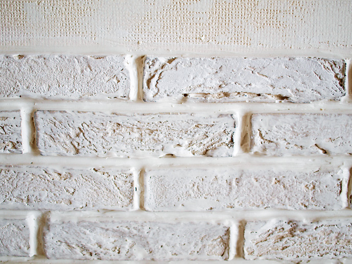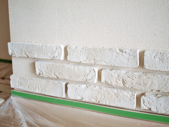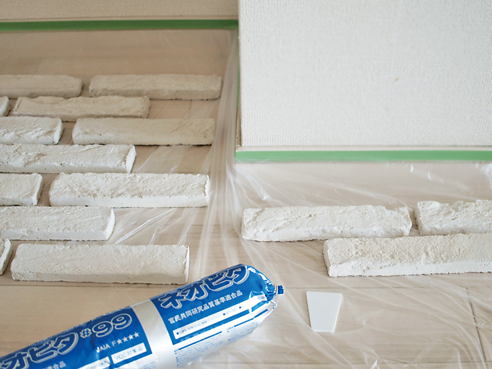 ブログや雑誌などでブリックタイルを張った壁の作例を見て、リビングの腰壁の材に採用することに。通販サイトなどで資材を物色し、アンティークレンガ風の白いブリックタイルをチョイス。