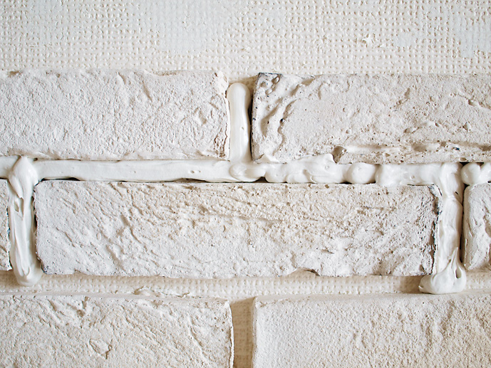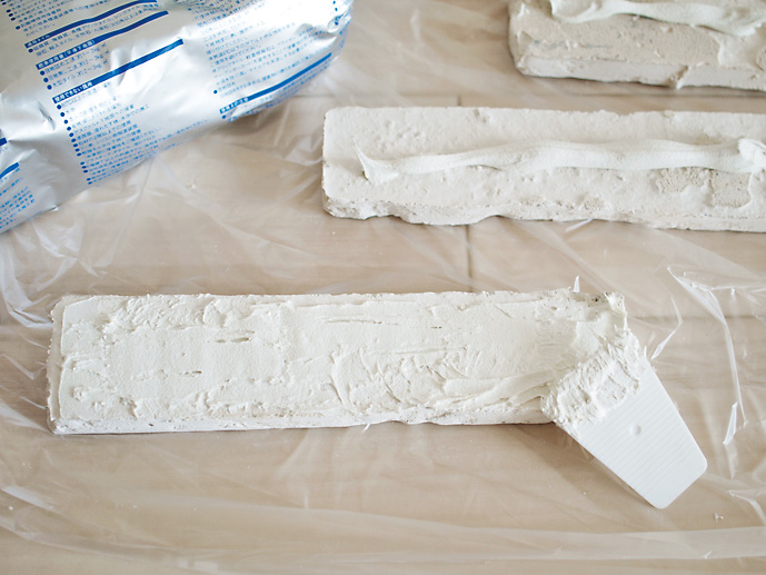 作業はシンプル。タイル用の接着剤をタイルに塗り、壁面に張るだけ。完全に接着されたところで、目地を埋めていけばOK。目地袋を使って目地を入れ、表面が少し乾いたら指で押し込んでならしていったそう。
