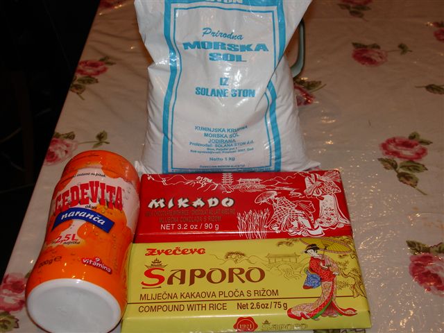 右のふたつは、こちらではどこのスーパーでも必ず置いてある『MIKADO』チョコと『SAPORO』チョコです。『MIKADO』チョコには穂を摘む着物姿の人の絵が、『SAPORO』チョコには傘を持つ着物姿の女性の絵が描いてあり、両方ともチョコの中にポップされたお米(ポップライス?)が入っています。この他にも同じようにお米入りのチョコでは『GEJSA』があります。『GEJSA』チョコは、ザグレブの映画館で『SAYURI』をみたときチケット購入時にプレゼントとして付いてきて、とっても嬉しかった思い出があります^^。