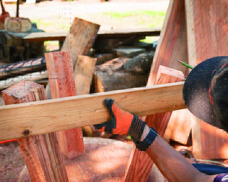 脚材、天板材をそれぞれ加工し、ホゾ組みする。ホゾ組みといっても、やはり緻密な作業は必要なし。現物合わせでガンガン組み立てていく。