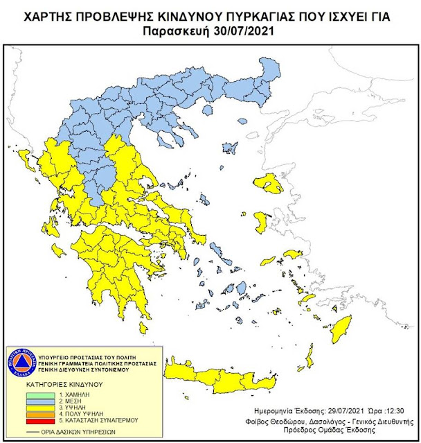 Σύμφωνα με το Χάρτη Πρόβλεψης Κινδύνου Πυρκαγιάς που εκδίδει η Γενική Γραμματεία Πολιτικής Προστασίας του Υπουργείου Εσωτερικών και Διοικητικής Ανασυγκρότησης, για σήμερα Παρασκευή 30 Ιουλίου, προβλέπεται υψηλός κίνδυνος πυρκαγιάς (κατηγορία κινδύνου 3), σε Αττική και Κύθηρα, σε περιοχές της Στερεάς Ελλάδας, της Ηπείρου και της Θεσσαλίας, σε Πελοπόννησο, Κρήτη, Δωδεκάνησα, Σάμο, Ικαρία, Χίο, Ψαρά, Μυτιλήνη και τα νησιά του Ιονίου.