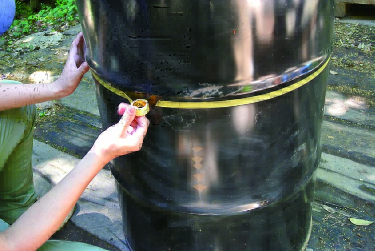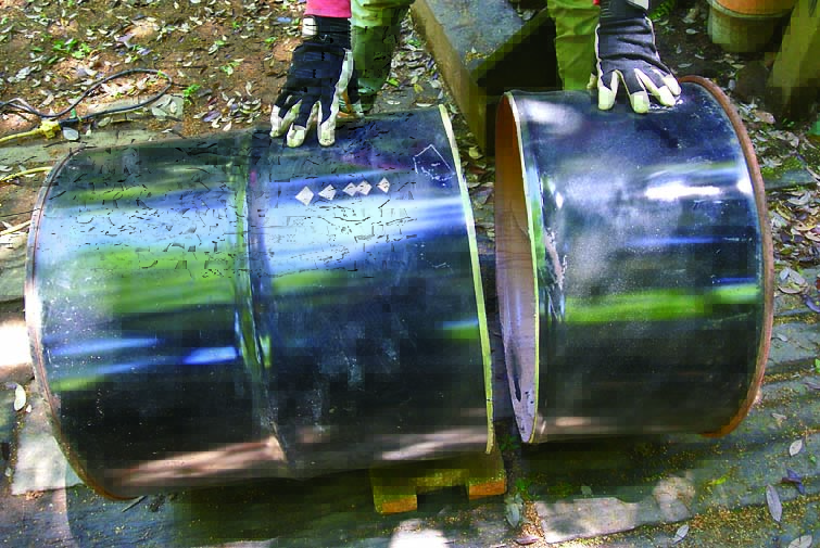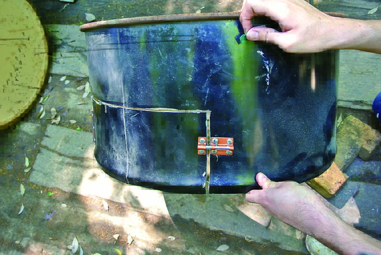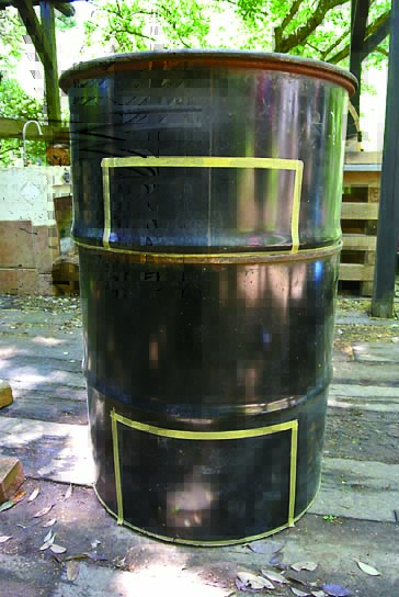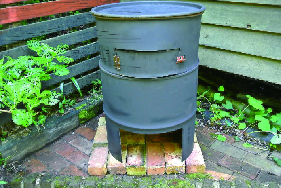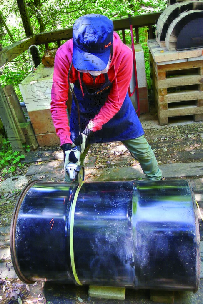 まずは、ドラム缶の出っ張り(輪帯)を目安に、3分の1(焼き室パーツ)と3分の2(燃焼室パーツ)サイズになるように切り分ける。燃焼室パーツをひっくり返して重ね、焼き室と燃焼室の入口、火床から上がってくる熱の通り道となる穴をあける。加工の際に出た端材で焼き室の扉を作り、全体を耐熱塗料で化粧すれば、もう完成。