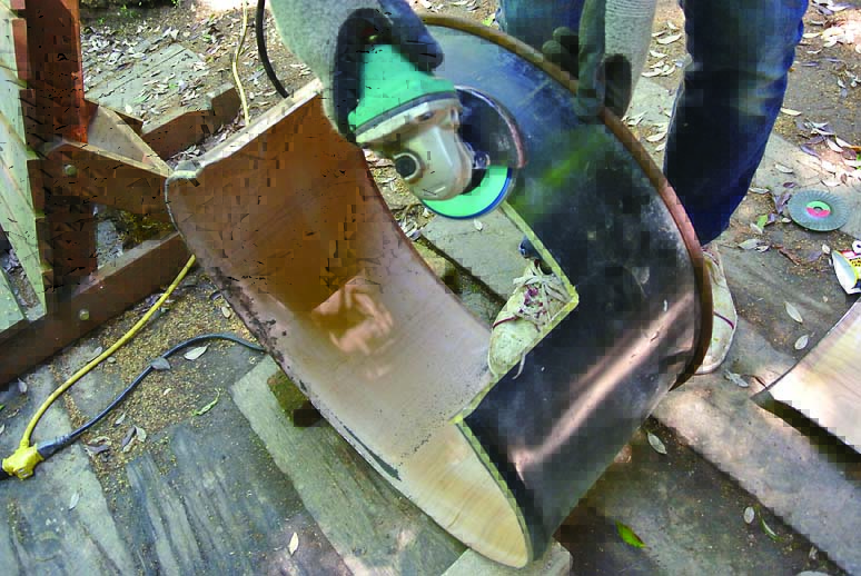200Lのドラム缶の板厚は1~1.6mm(種類によって異なる)で、鉄工用ディスクを装着したディスクグラインダーならば難なく加工することができるが、キックバックが起こらないようにじっくり進めよう。また、金属加工時は激しく火花が散るので、手袋や防護メガネ、長そでやエプロンを着用したい。