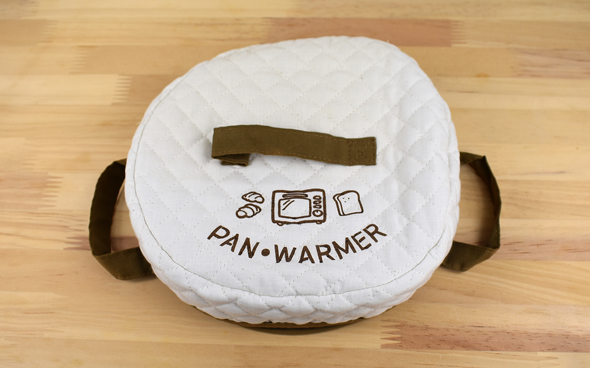 温め終わってレンジから取り出してみると、キルト地の素材がほんのり温まっているのを感じました。陶器やプラスチック製の素材が多いキッチングッズですが、同商品に使われているのは綿とポリエステル。これらの素材が、パンから出た余計な蒸気を吸収してくれる仕組みになっているんです。