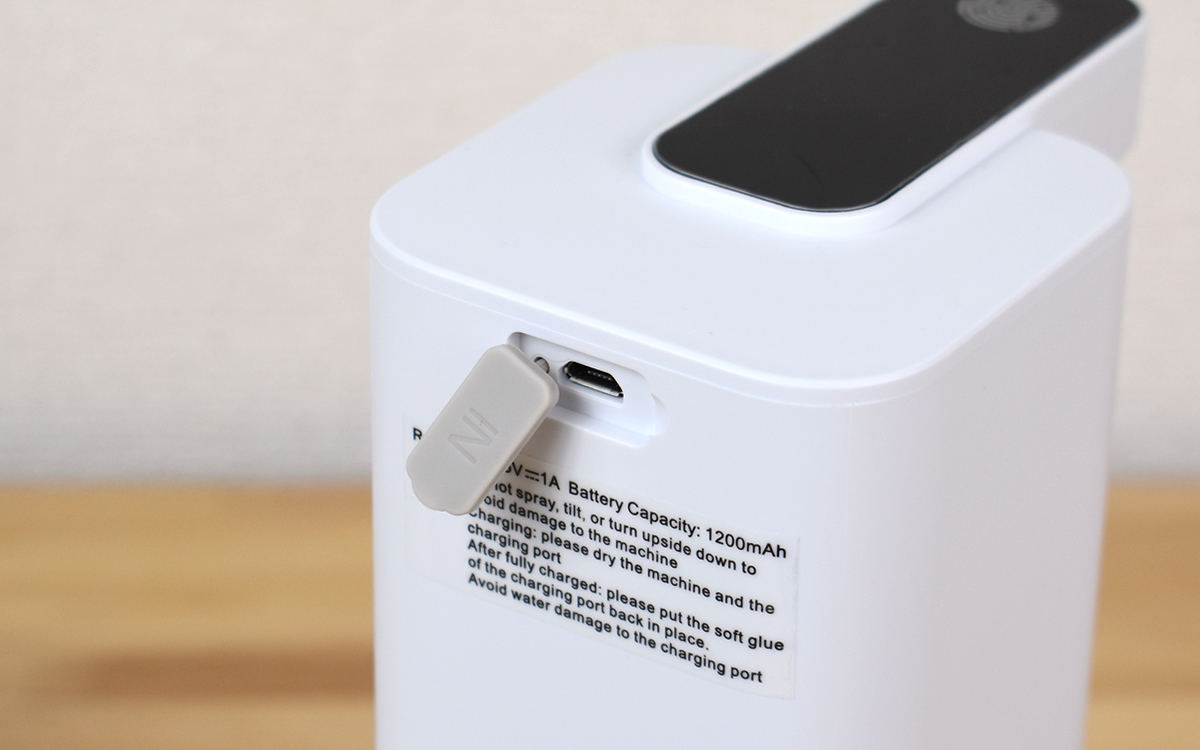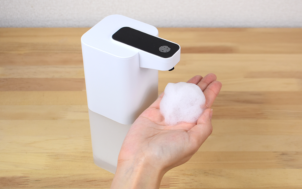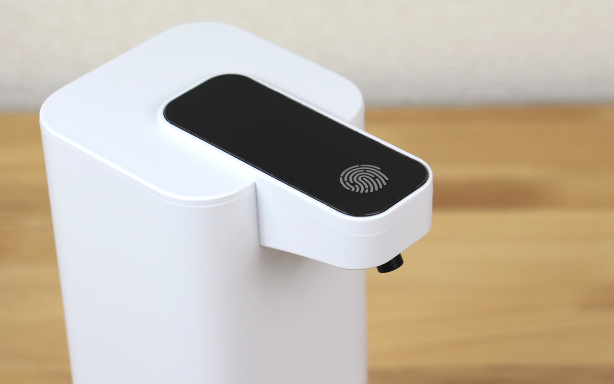 本体先端のタッチスイッチを2秒間長押しすると電源が入るので、あとは液出口の奥にあるセンサーに届くよう手を差し出すだけ。実際に感度を確かめてみたところ、ほぼタイムラグなく稼働音が響いて泡が出てきました。