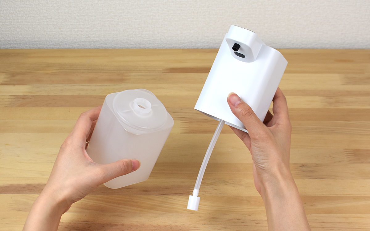それでは充電を終えたディスペンサーを使って、泡を出してみましょう。セッティングは簡単で、まずはタンクを回転させて本体から分離。タンクに適量のハンドソープ液を入れ、再び本体に戻せば準備はOKです。