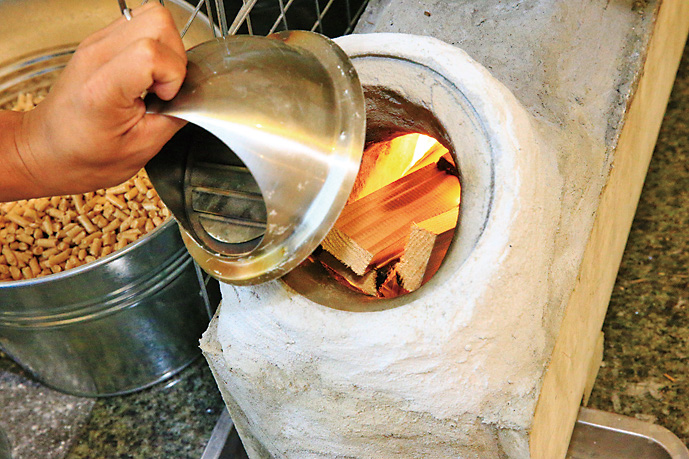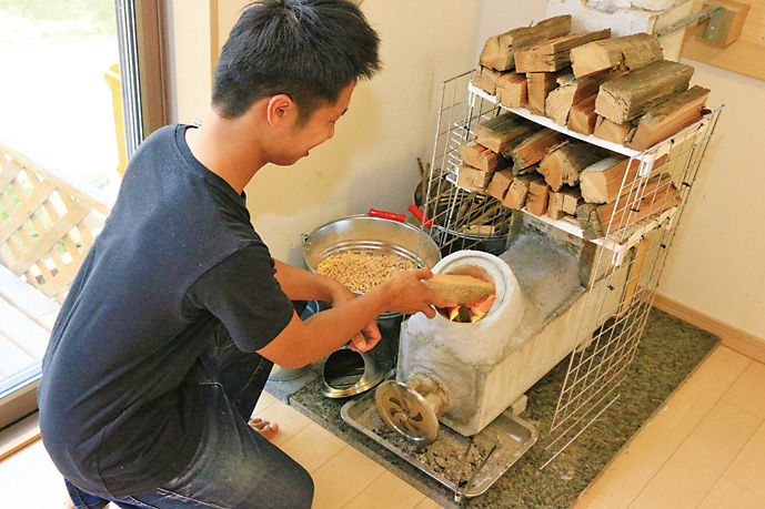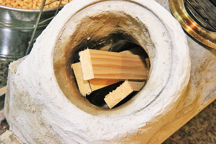 ここまでロケットストーブのメリットばかり紹介してきたが、もちろんいいところばかりではない。実はこのストーブ、意外と手がかかる。その中でも多くのユーザーが声を上げるのが「薪をくべるのが忙しい」という点。その圧倒的な燃焼効率の良さから細い薪はすぐに燃え尽きてしまうので、とにかく薪の投入が忙しい。加えて、焚き口が上方向に向いているロケットストーブは薪を縦にしか入れられず、また投入できる量も少ない。薪ストーブのように、薪をドンと入れて放っておく、ということができないのだ。早くて10分、長くても40分に1回は薪の様子を見てやらねばならない。そのため、焚き口を改良し、大きな薪を横にして突っ込めるようにして、薪の投入時間の間隔を延ばしているユーザーもいる。