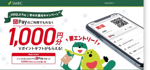 三井住友カードは24日、三井住友銀行およびSMBCファイナンスサービスと共同で「~冬の大還元キャンペーン~UNIQLO Payでもれなく1,000円分のVポイントギフトがもらえる!」( https://www.smbc-card.com/camp/00022/index.html )を2021年12月1日(水)から12月19日(日)まで実施すると発表しています。