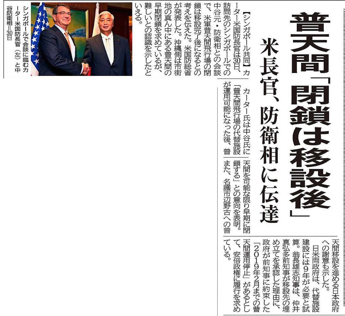 普天間閉鎖直に、異常事態が発生している。これまで政府は「2019年2月」に運用停止すると公約してきており、これに対しては「そもそも不可能だ」という議論が行われてきた。 今回、カーター米国防長官は 「普天間基地の代替施設が運用可能になった後、普天間を可能な限り早期に閉鎖する」 との意向を表明したと沖縄タイムスが報じている。 続きを読む